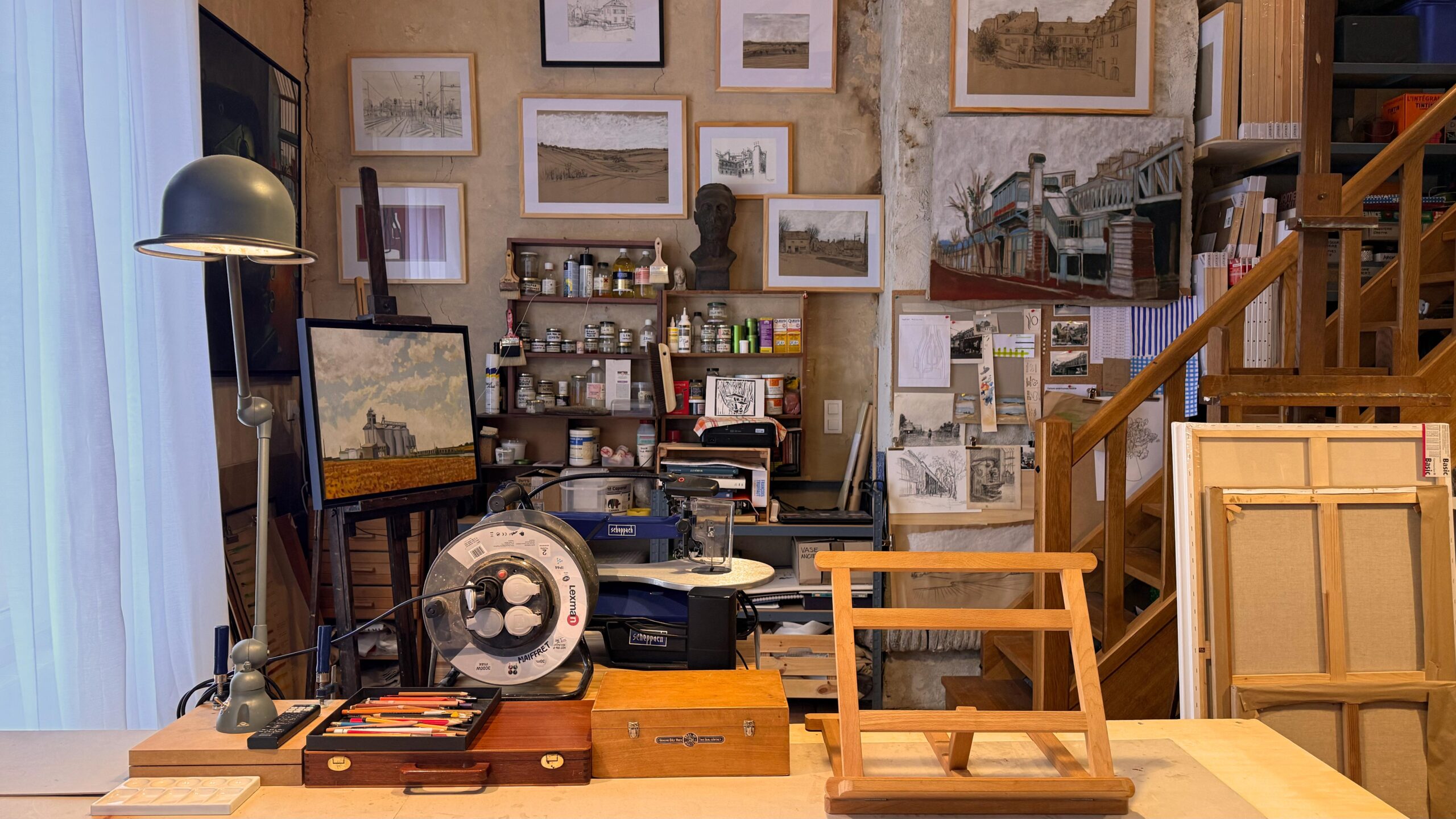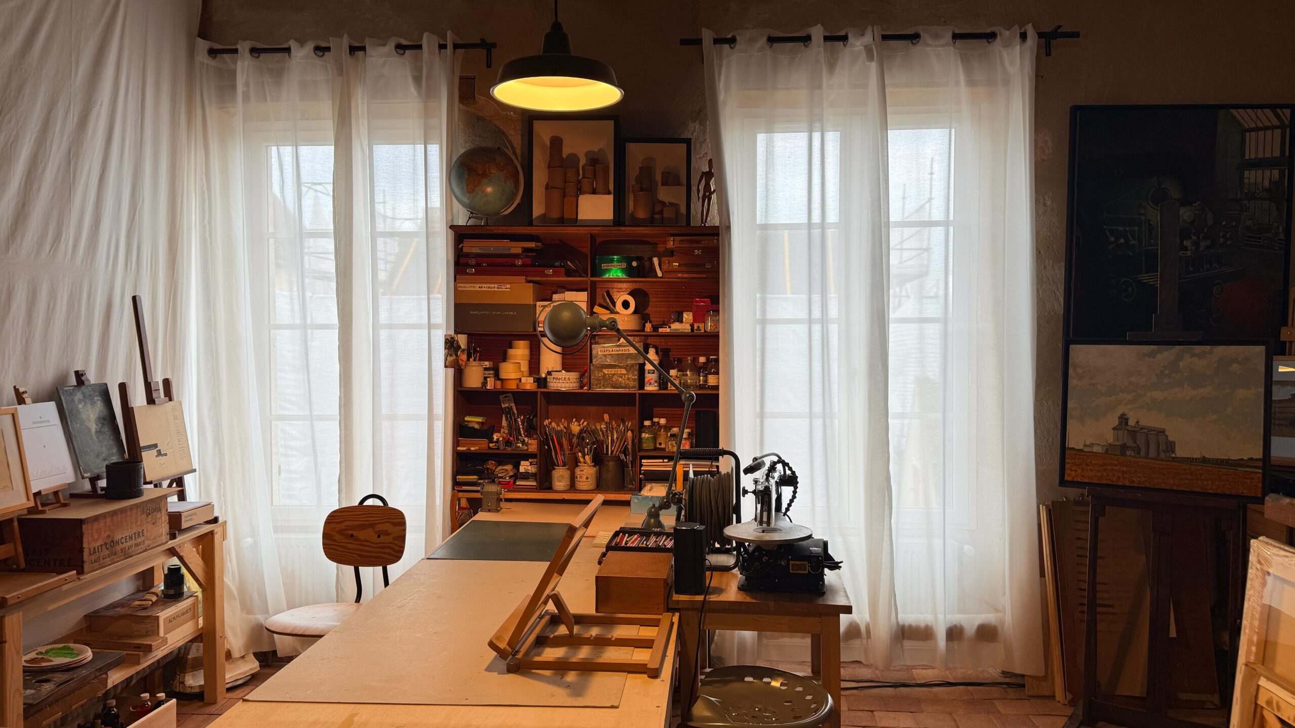 Pour Antoine Maiffret, l'atelier n'est pas un simple espace de travail : c'est le cœur même de sa création. À la différence d'un bureau, où l'on s'installe, l'atelier se vit debout, dans le mouvement et l'action. Chaque outil, chaque flacon, chaque pinceau y a sa place, participant à une harmonie à la fois visuelle et fonctionnelle. C'est dans ce lieu, souvent bercé par la musique, que l'artiste façonne son univers. Seul face à sa toile, Antoine Maiffret a choisi de placer son travail sous l'égide de l'Atelier Maiffret, une entité qui incarne l'alliance entre l'homme, son art et son espace de création.