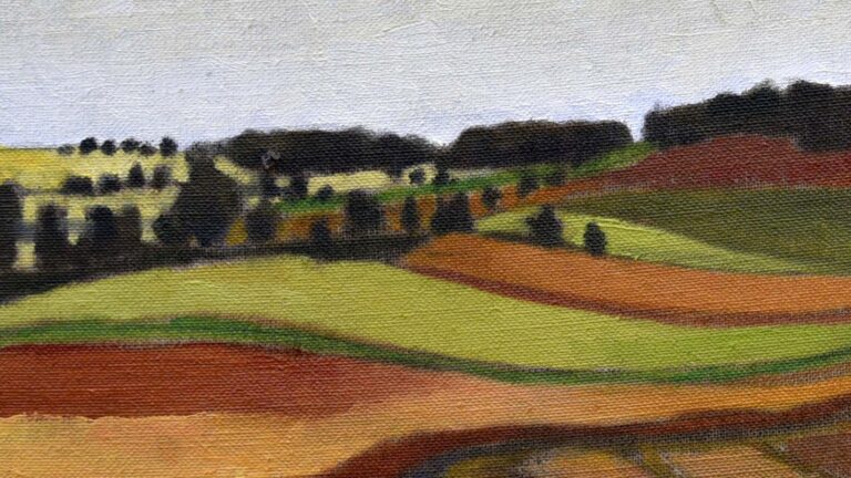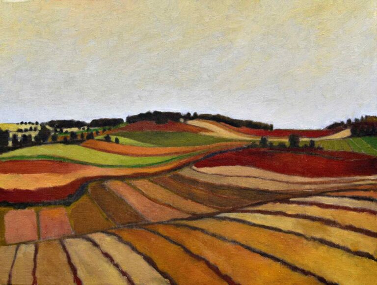 Peinture à l’huile réalisée sur un chemin en périphérie du village de Sainpuits présente les champs derrière lesquels se trouve le lieu dit Champmartin. Paysage typique de la région Puisaye-Forterre. Peinte et dessinée de toutes saisons.