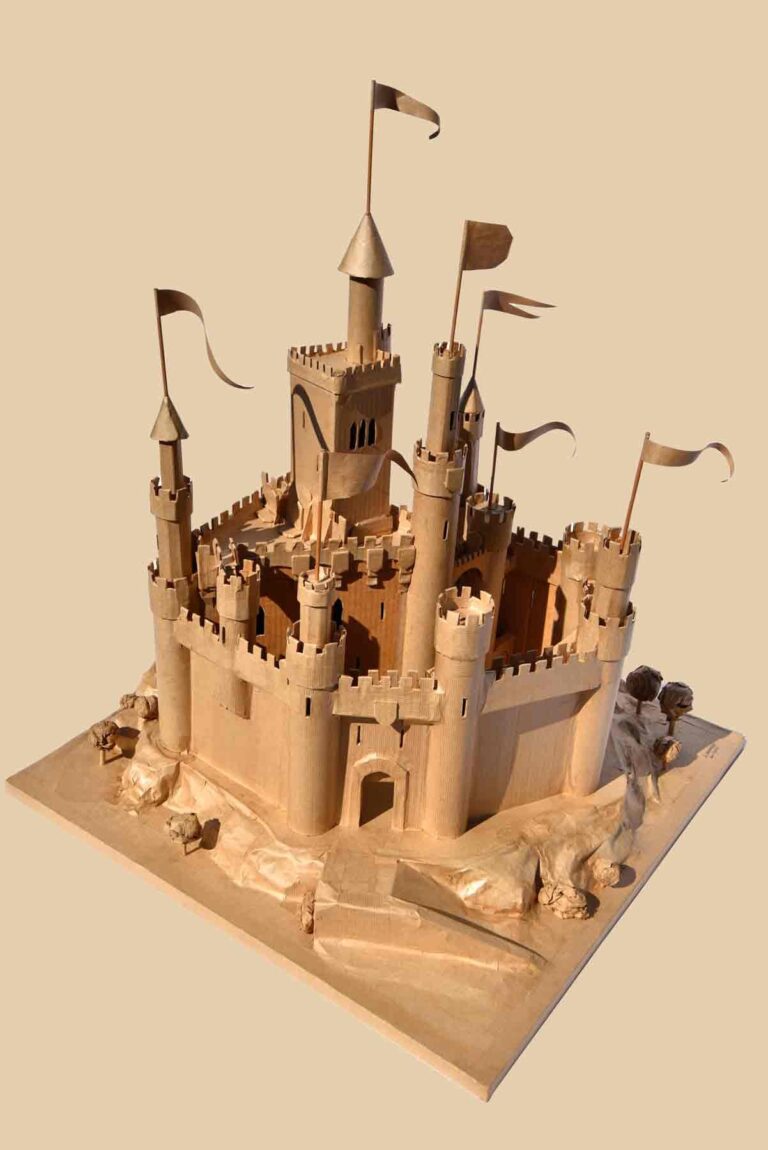Fabriquer un château-fort en carton est une démarche relativement classique voir banale, pourrait-on se dire. Néanmoins, je trouve cet objet tellement important, notamment dans le contexte sociétal soucieux des enjeux climatiques et environnementaux que vous connaissez. Cette maquette a été entièrement réalisée à l’aide d’emballage en carton, de baguettes de bois, de colle et de papier kraft, le tout reposant sur une simple planche de bois, elle-même recyclée.
