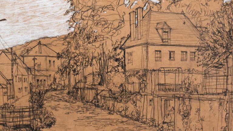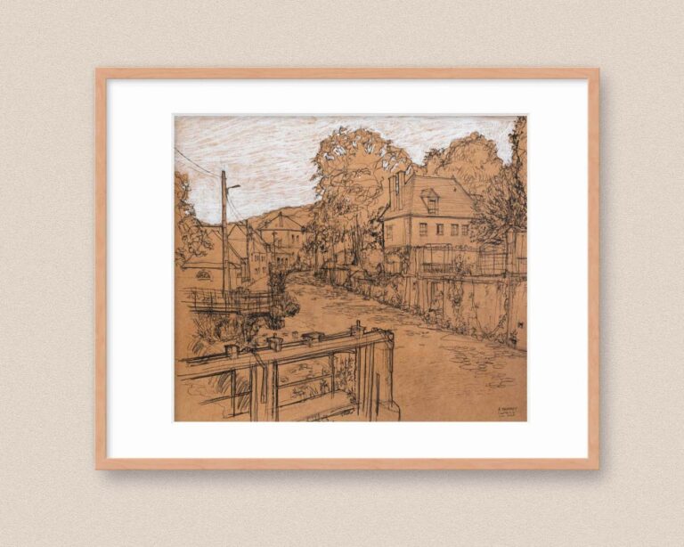 Dessin de la maison des Ponts verts L. Marcelot et ses fils à Clamecy, devant le Beuvron.