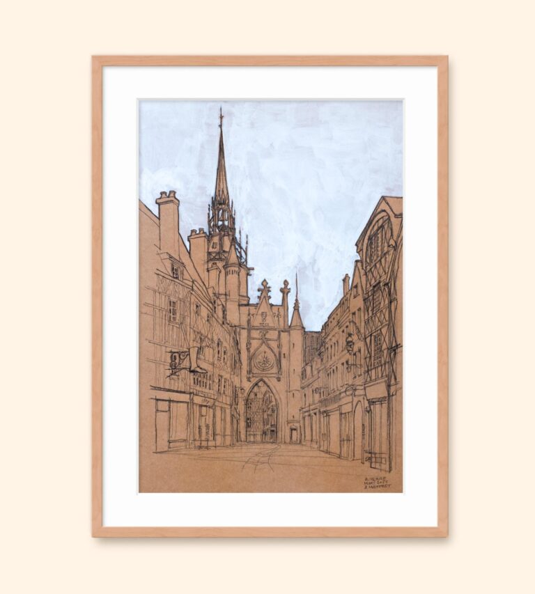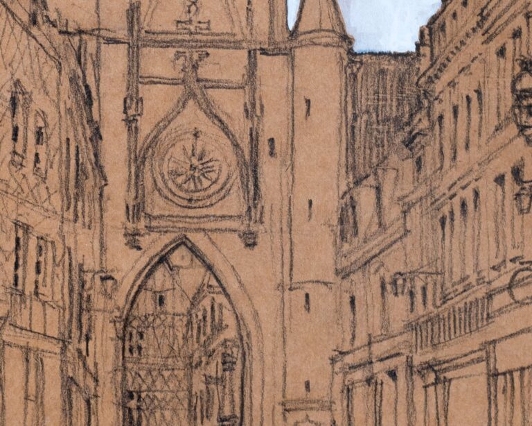 Vue de la célèbre horloge d’Auxerre. Fusain gras et gouache.